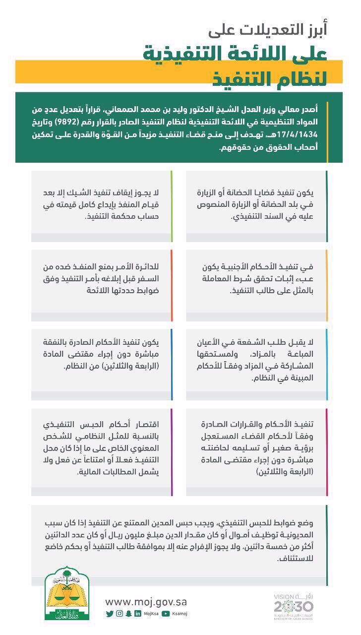 اللائحة التنفيذية لنظام التنفيذ. نظام التنفيذ ولائحته التنفيذية الصادرة 23 02 1439 هـ مستشار منعم يسري نوفمبر 13 2017 أنظمة ولوائح التعليقات على نظام التنفيذ ولائحته التنفيذية الصادرة 23 02 1439 هـ مغلقة 51 مشاهدات. اللائحة التنفيذية لنظام التنفيذ النظام. يقصد بالألفاظ والعبارات الآتية أينما وردت في هذا النظام المعاني المبينة أمام كل منها مالم يقتض السياق خلاف ذلك. طلب التنفيذ الإلكتروني طلب ترخيص مقدم خدمة تنفيذ خدمات القضاء التجاري الطلبات على القضايا ناجز المحاكم الاستعلام عن موعد قضية تقديم طلب للدوائر الإنهائية نشر بيانات التنفيذ.