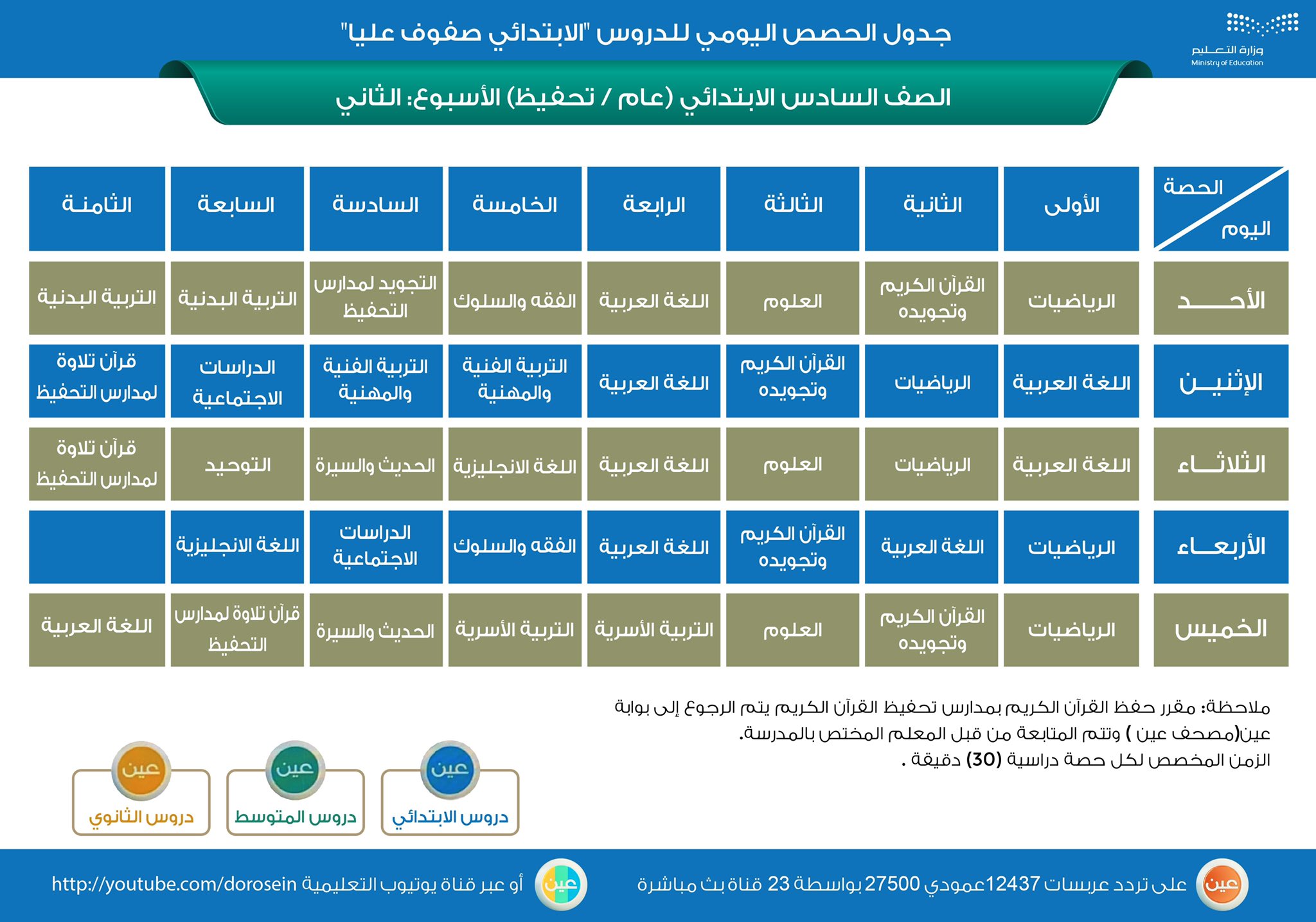 وزارة التعليم عام On Twitter جدول الحصص اليومي لدروس الصفوف الرابع والخامس والسادس الابتدائي عبر قنوات عين على تردد عربسات 12437 عمودي فى بث مباشر من الساعة 8 ص إلى الساعة