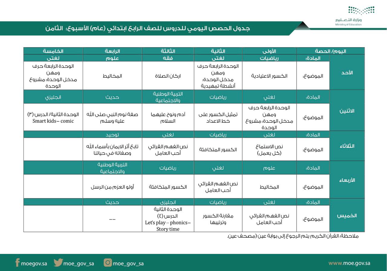 وزارة التعليم عام Twitterissa جدول الحصص اليومي لدروس الصفوف الرابع والخامس والسادس الابتدائي عبر قنوات عين على تردد عربسات 12437 عمودي فى بث مباشر من الساعة 8 ص إلى الساعة 12 30