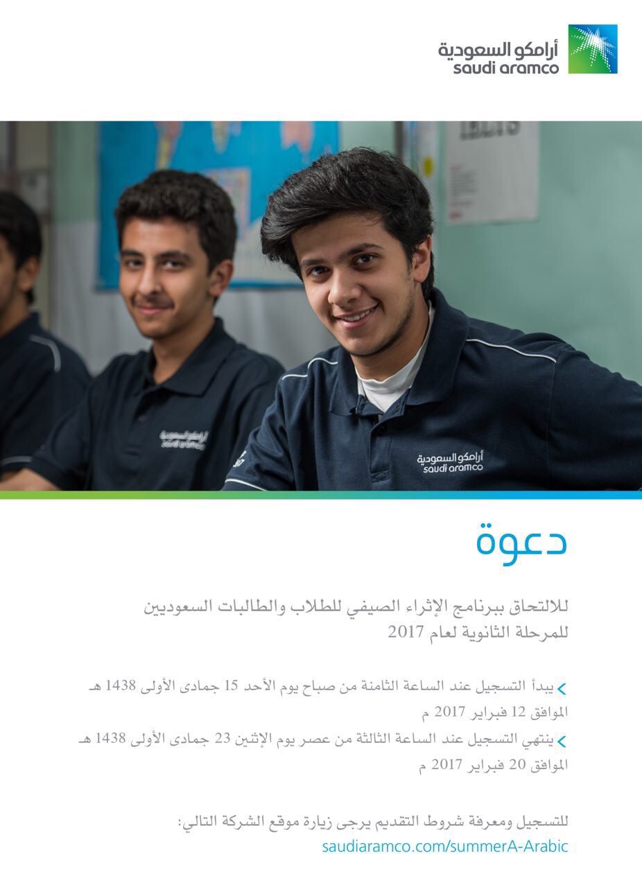 برنامج الإثراء الصيفي لطلاب المرحلة الثانوية. أعلنت شركة أرامكو عن موعد التقديم في برنامج الإثراء الصيفي للمرحلة الثانوية وذلك بتطوير الشباب السعوديين من ذوي القدرات العالية عن طريق توفير فرص تدريب صيفية حيث يتلقى الطلاب والطالبات المشاركون.